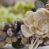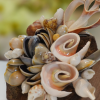 - Cấu trúc: Các loại vỏ ốc được sắp đặt khéo léo thành hình một bông hoa đang nở. Tầng ngoài là những cánh lớn bằng vỏ vẹm xanh xếp tỏa tròn, bên trong là lớp vỏ sò điệp nhỏ uốn cong tạo thành nhiều lớp cánh. Trung tâm hoa là điểm nhấn đặc biệt với ốc nón nhỏ.