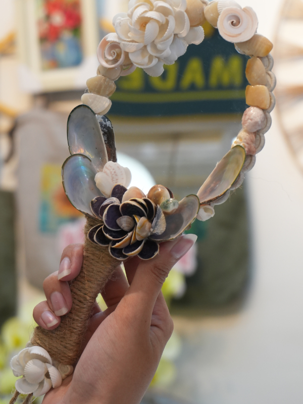 Chiếc gương cầm tay được chế tác hoàn toàn thủ công từ những vỏ ốc biển tự nhiên, qua bàn tay khéo léo của nghệ nhân Trần Thị Ngọc Hiếu, trở thành một tác phẩm nghệ thuật độc bản. Không chỉ là vật dụng, chiếc gương còn mang trong mình ý nghĩa sâu sắc, tái sinh những vỏ ốc, sò tưởng chừng bỏ đi, góp phần bảo vệ môi trường và lan tỏa lối sống xanh bền vững. Sản phẩm còn là món quà tinh tế và ý nghĩa, tôn vinh sự khéo léo của đôi bàn tay Việt và gửi gắm thông điệp về hạnh phúc, may mắn.