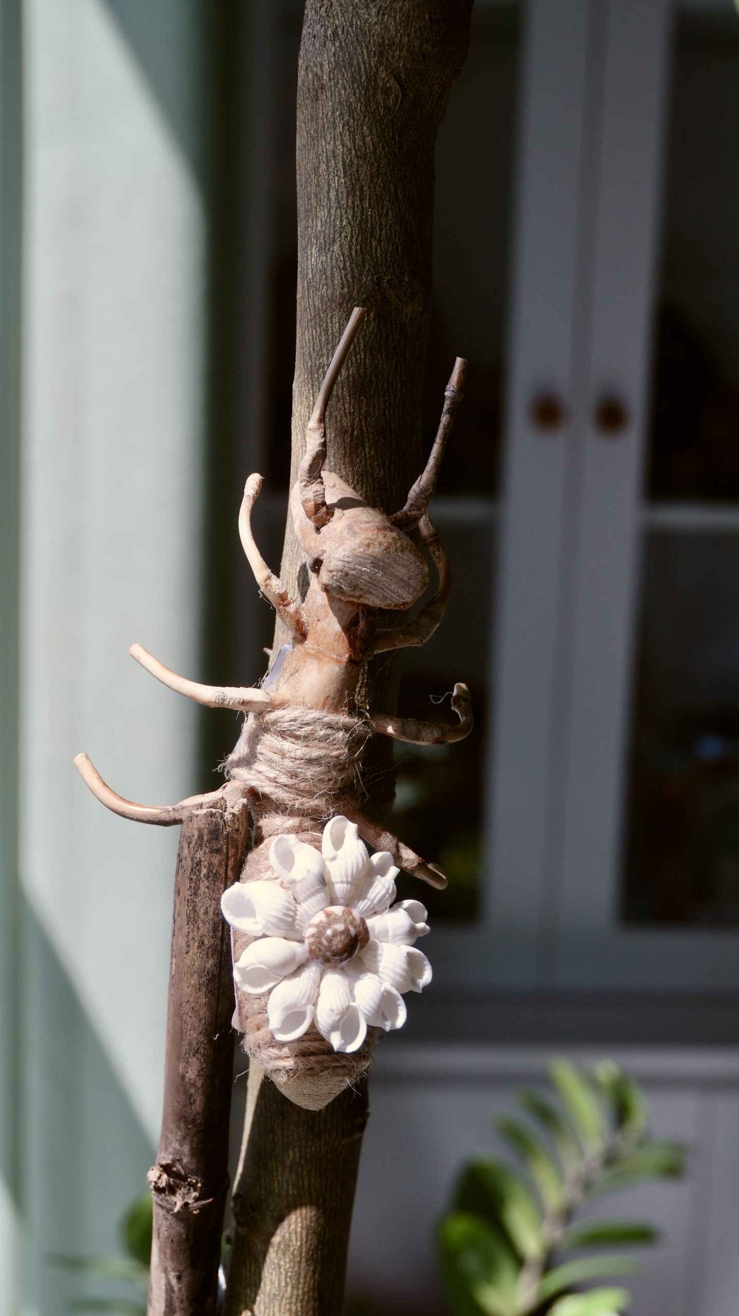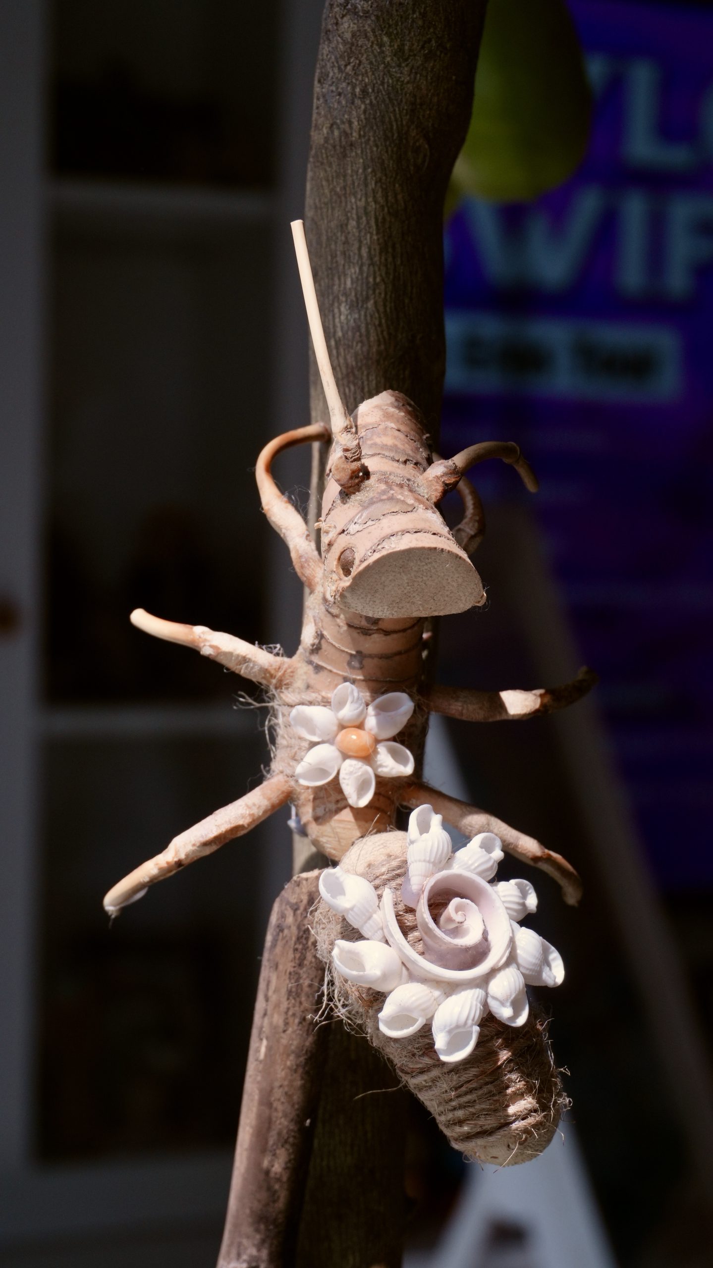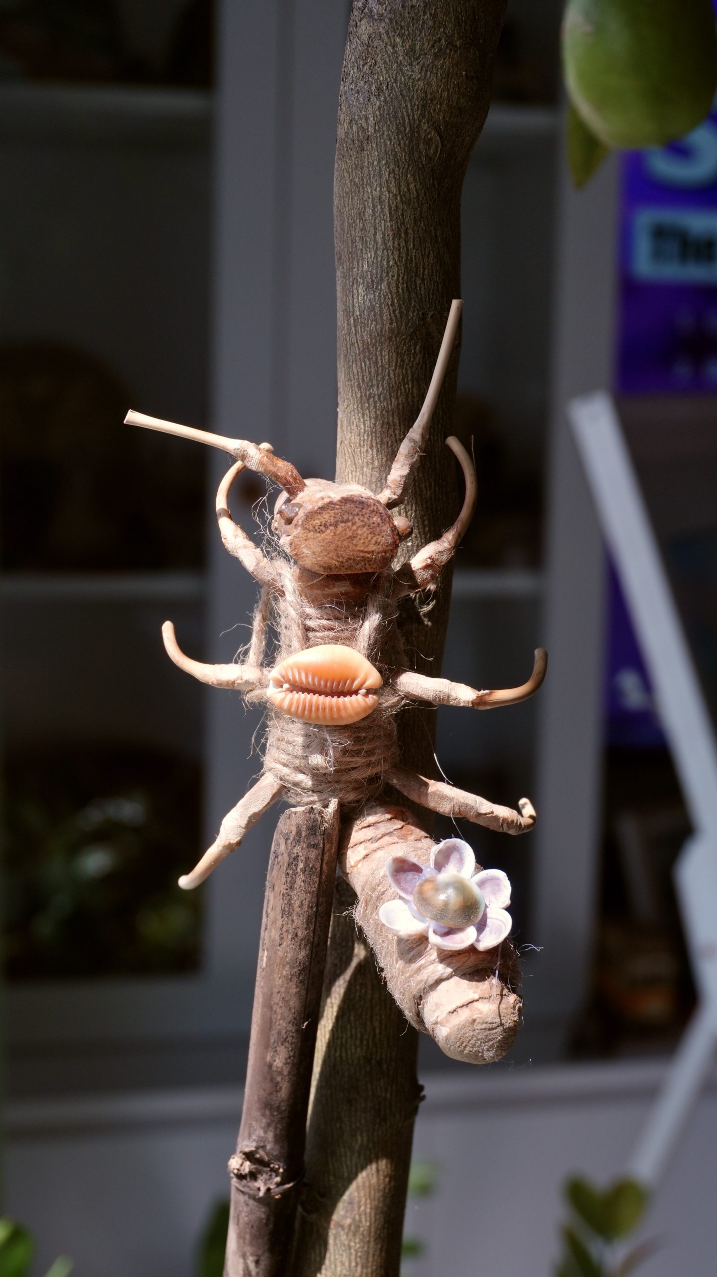- Materials: Aged bamboo root, natural seashells/conches, jute twine, and a magnet.