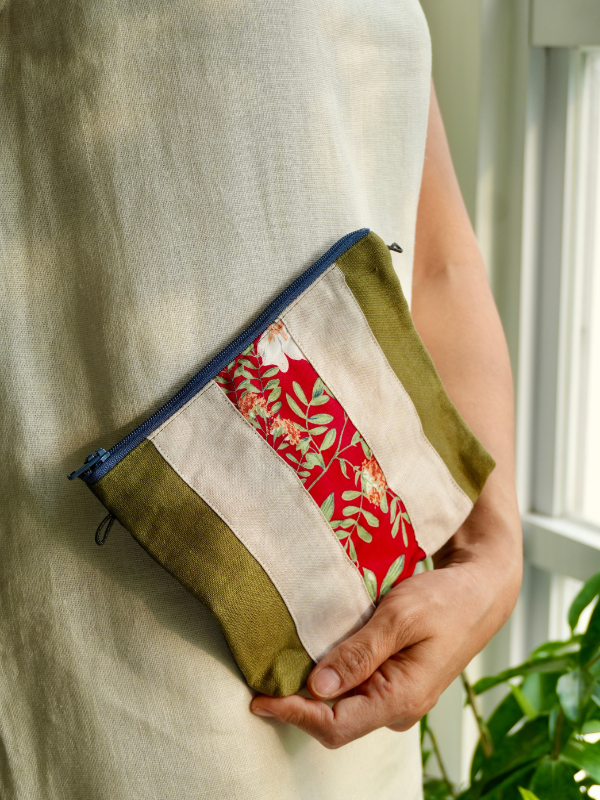 The vibrant floral motif is cleverly pieced together from upcycled fabric scraps, reducing textile waste and ensuring each pouch is a one-of-a-kind artwork.