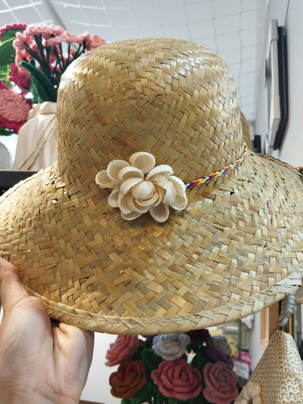 Cỏ bàng được thu hái từ những cánh đồng miền Trung, phơi khô dưới nắng vàng và nhờ bàn tay tỉ mỉ bởi những người thợ lành nghề đã trở thành chiếc nón xinh xắn. Các nghệ nhân điểm xuyết trên nón những bông hoa ốc nhỏ xinh, tạo nên điểm nhấn duyên dáng và độc đáo, không chỉ là chi tiết trang trí mà còn biểu trưng cho sự giao hòa giữa biển cả và đất liền, giữa con người và thiên nhiên.