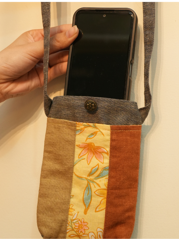 Chiếc túi đeo điện thoại được làm từ chất liệu tự nhiên kết hợp sự sáng tạo của nghệ thuật may chắp vá. Dáng túi gọn và thiết kế tỉ mỉ, sản phẩm vừa tiện dụng vừa thể hiện phong cách cá nhân riêng biệt.